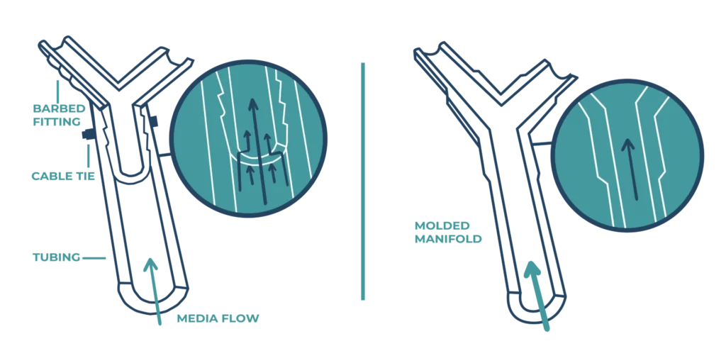 Molded Manifolds have an uninterrupted flow path which eliminates leaks and liquid entrapment as well as eliminates contamination and cell shearing from hose barb impact